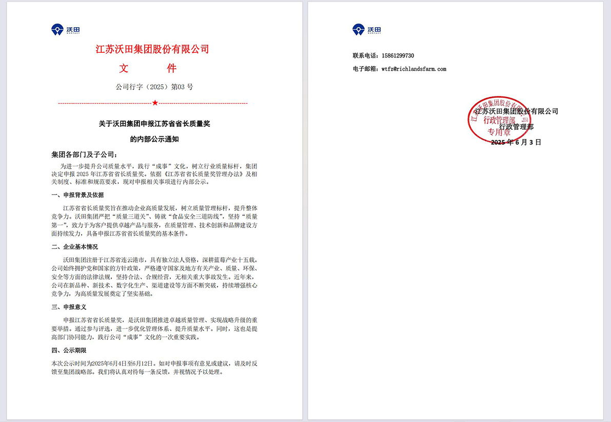 關于沃田集團申報江蘇省省長質量獎的內部公示通知